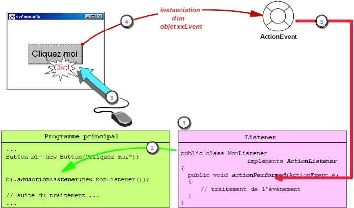Quand on clique sur un JButton, un objet événement est potentiellement instancié. Quand on déplace la souris, un événement est aussi potentiellement généré. Bien que vous puissiez générer vos propres événements cela n’est pas nécessaire avec les Composants AWT/SWING.
