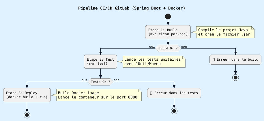 stages: - build - test - deploy build: script: mvn clean package (lancer de maven, nettoyer, compiler et empaqueter dans un jar) test: script: mvn test (lancer les tests unitaires si ko, notre pipeline s'arrête) deploy: script: docker build -t monapp . && docker run -d -p 8080:8080 monapp (créer une image docker nommée monapp et lance le conteneur)