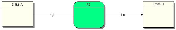 Une occurrence de l’entité A est associée à une et une seule occurrence de la relation R7. Une occurrence de l’entité B est associée au minimum à une occurrence et au maximum à plusieurs occurrences de la relation R7.