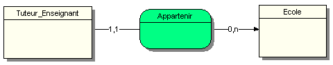 Dans cet exemple, un Tuteur_enseignant appartient à une et une seule école, tandis qu’une école peut n’avoir aucun ou plusieurs Tuteur_Enseignants. On utilise souvent cette formulation simplifiée comme si l’on parlait d’occurrences plutôt que d’entités. Lorsque nous sommes en présence d’une association ternaire ou n-aire, cette formulation n’est plus possible car l’on doit raisonner par couple ou triplet (voir cours Merise - MCD).