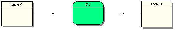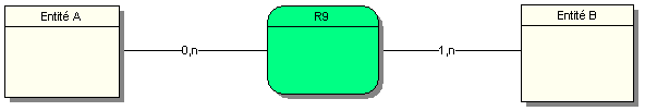 Une occurrence de l’entité A est associée à aucune ou plusieurs occurrences de la relation R9. Une occurrence de l’entité B participe au minimum une fois et au maximum plusieurs fois à une occurrence de la relation R9.