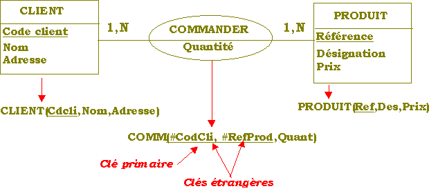 La clé primaire de la table issue de l’entité côté cardinalités (0,n) ou (1,n) est dupliquée dans la table issue de l’entité côté cardinalités (1,1) où elle devient clé externe.
