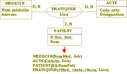 La clé primaire de la table issue de l’entité côté cardinalités (0,n) ou (1,n) est dupliquée dans la table issue de l’entité côté cardinalités (0,1) où elle devient clé externe qui peut être une valeur nulle.