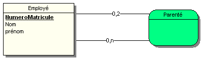 Les associations qui comportent une cardinalité 1,1 sur l’une des pattes ne sont jamais porteuses de propriétés. Celles-ci “migrent” sur l’entité déterminante.